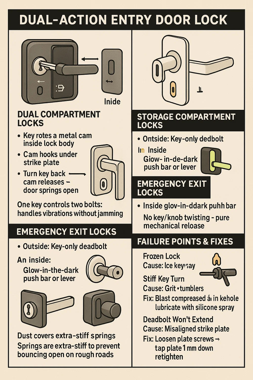 Why it's unique: One key controls two bolts; handles vibrations without jamming.
