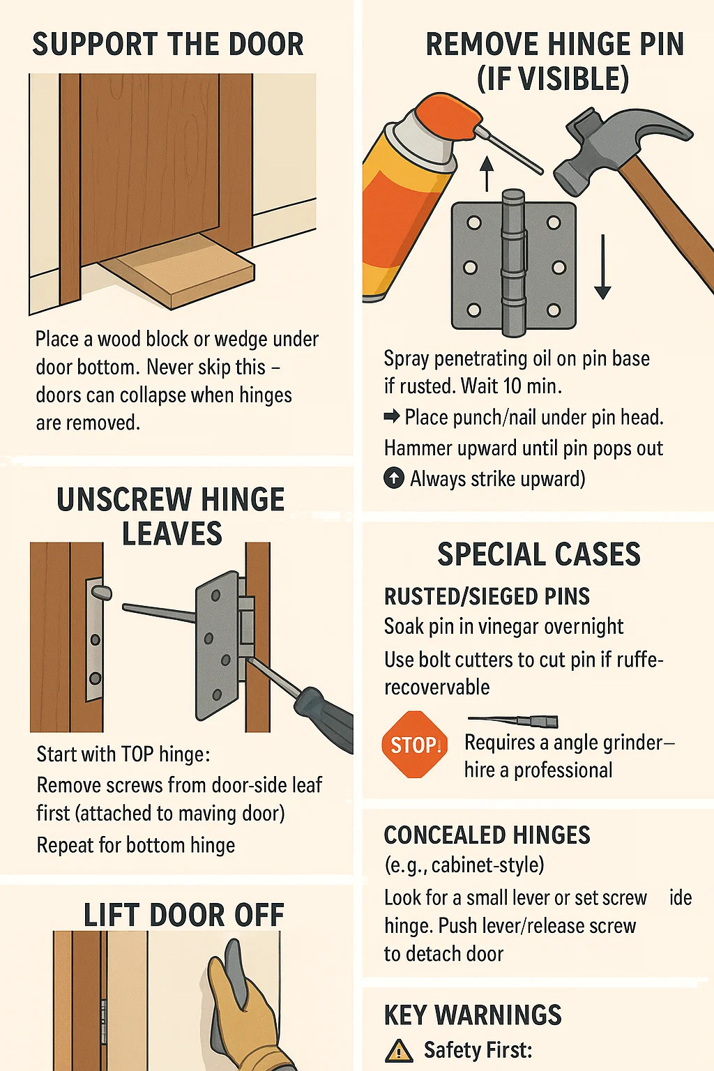Here's a step-by-step guide to removing a door hinge, focusing on practical methods and safety: