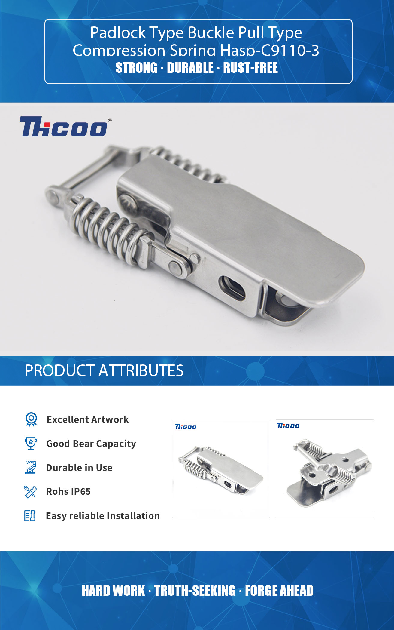 Founded in 2009, As China Padlock Type Buckle Pull Type Compression Spring Hasp-C9110-3 Suppliers ,THCOO Corporation has been operating with ingenuity for 13 years. It is a high-tech enterprise integrating independent research and development, production, sales and service. It is a leading domestic hardware intelligent integrated system solution provider.