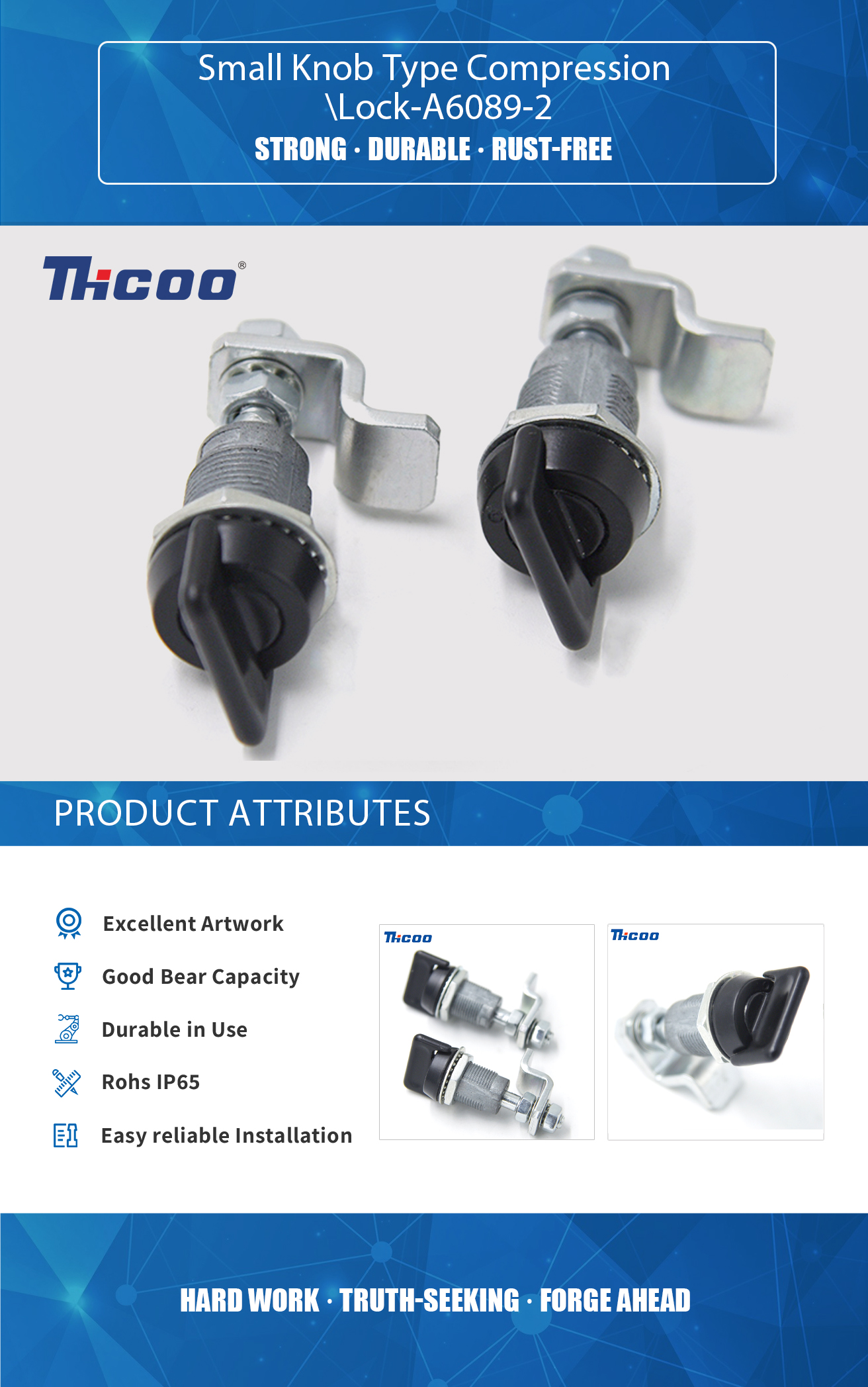Founded in 2009, As China Small Knob Type Compression Lock-A6089-2 Suppliers ,THCOO Corporation has been operating with ingenuity for 13 years. It is a high-tech enterprise integrating independent research and development, production, sales and service. It is a leading domestic hardware intelligent integrated system solution provider.