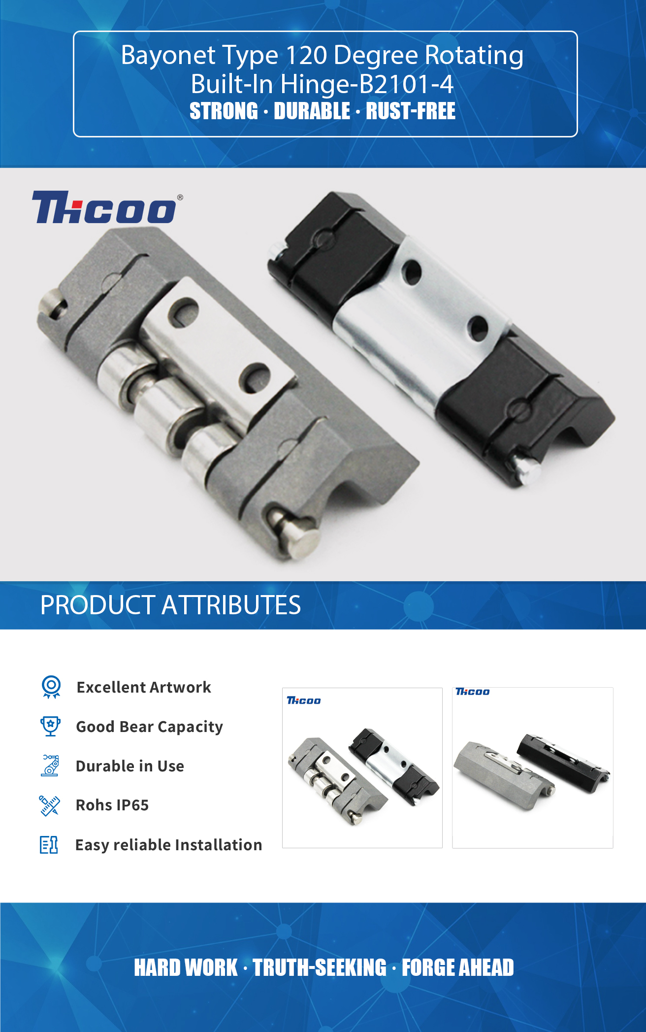 Founded in 2009, As China Bayonet Type 120 Degree Rotating Built-In Hinge-B2101-4 Suppliers ,THCOO Corporation has been operating with ingenuity for 13 years. It is a high-tech enterprise integrating independent research and development, production, sales and service. It is a leading domestic hardware intelligent integrated system solution provider.