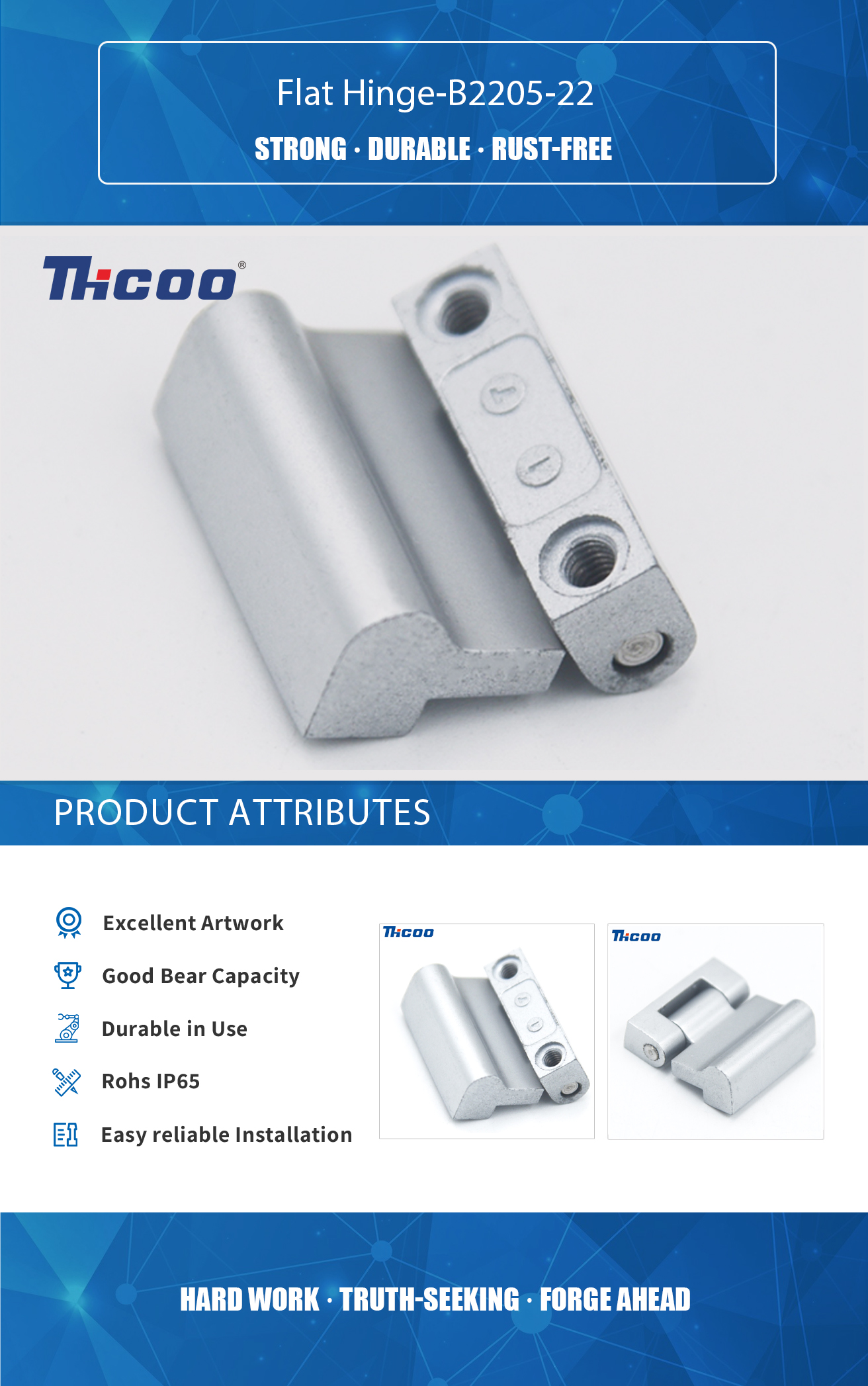 Founded in 2009, As China Flat Hinge-B2205-22 Suppliers ,THCOO Corporation has been operating with ingenuity for 13 years. It is a high-tech enterprise integrating independent research and development, production, sales and service. It is a leading domestic hardware intelligent integrated system solution provider.