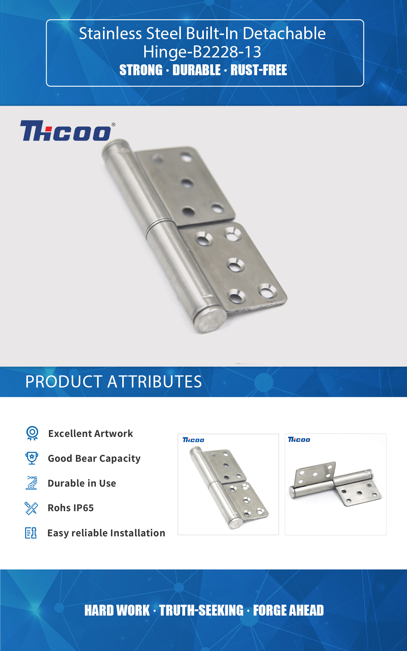 Founded in 2009, As China Stainless Steel Built-In Detachable Hinge-B2228-13 Suppliers ,THCOO Corporation has been operating with ingenuity for 13 years. It is a high-tech enterprise integrating independent research and development, production, sales and service. It is a leading domestic hardware intelligent integrated system solution provider.