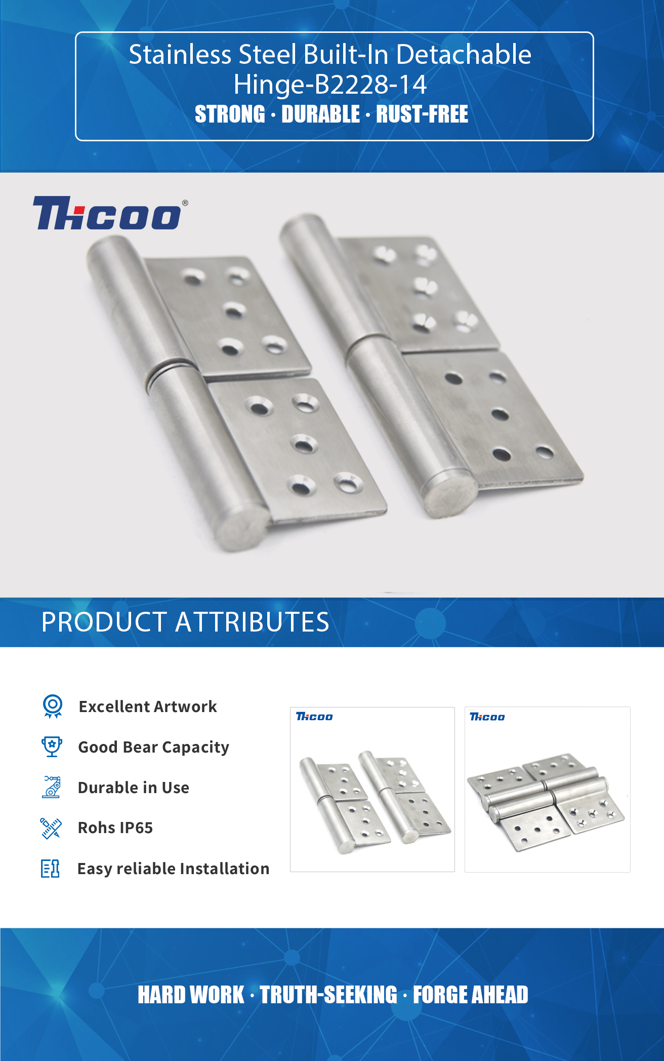 Founded in 2009, As China Stainless Steel Built-In Detachable Hinge-B2228-14 Suppliers ,THCOO Corporation has been operating with ingenuity for 13 years. It is a high-tech enterprise integrating independent research and development, production, sales and service. It is a leading domestic hardware intelligent integrated system solution provider.