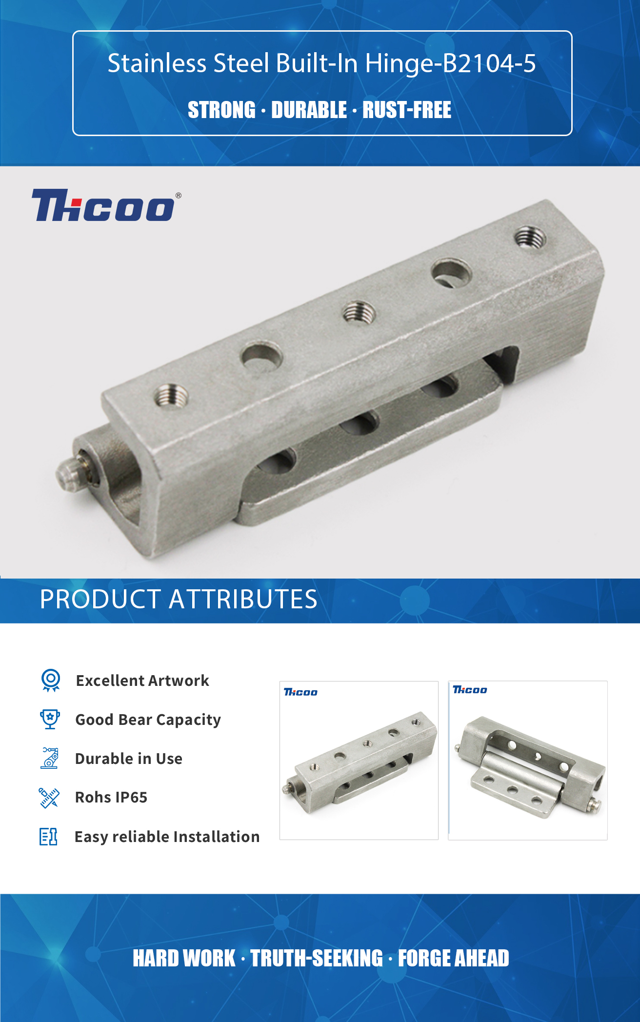 Founded in 2009, As China Stainless Steel Built-In Hinge-B2104-5 Suppliers ,THCOO Corporation has been operating with ingenuity for 13 years. It is a high-tech enterprise integrating independent research and development, production, sales and service. It is a leading domestic hardware intelligent integrated system solution provider.
