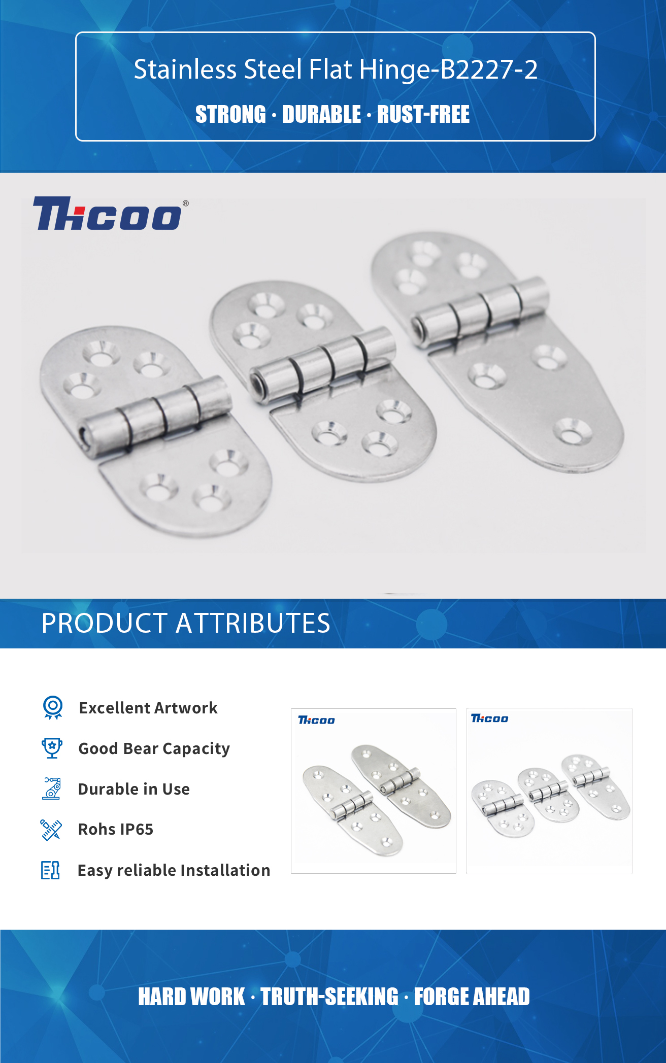 Founded in 2009, As China Stainless Steel Flat Hinge-B2227-2 Suppliers ,THCOO Corporation has been operating with ingenuity for 13 years. It is a high-tech enterprise integrating independent research and development, production, sales and service. It is a leading domestic hardware intelligent integrated system solution provider.